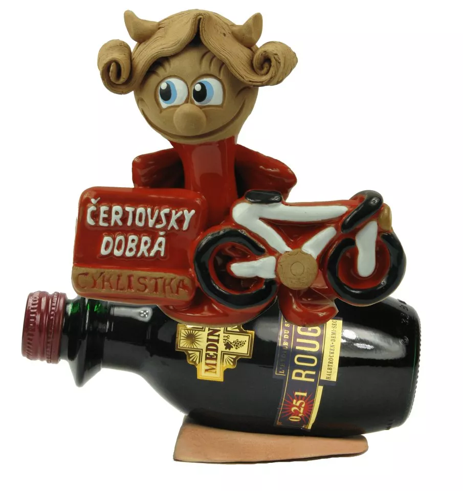 Postavička sedí na víne, ktoré je umiestnené na keramickom podstavci. Vína používame francúzske a to JP.Chenet a Medinet rôznych odrôd o objeme 0,25 l.