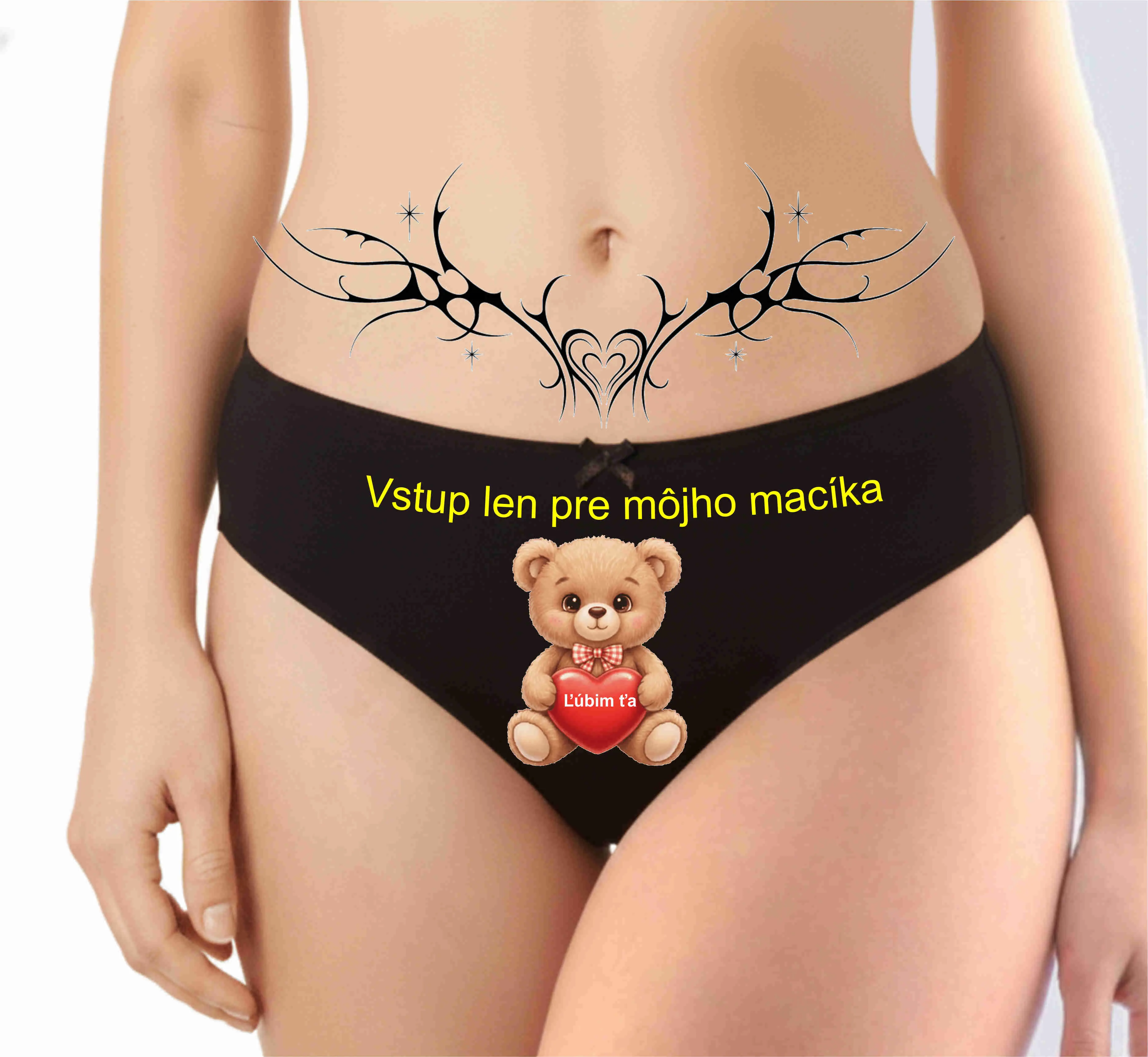 Hravý odkaz: Pod mackom je vtipný a intímny nápis „Vstup len pre môjho macíka“, ktorý dodáva bielizni osobný a šarmantný dotyk.