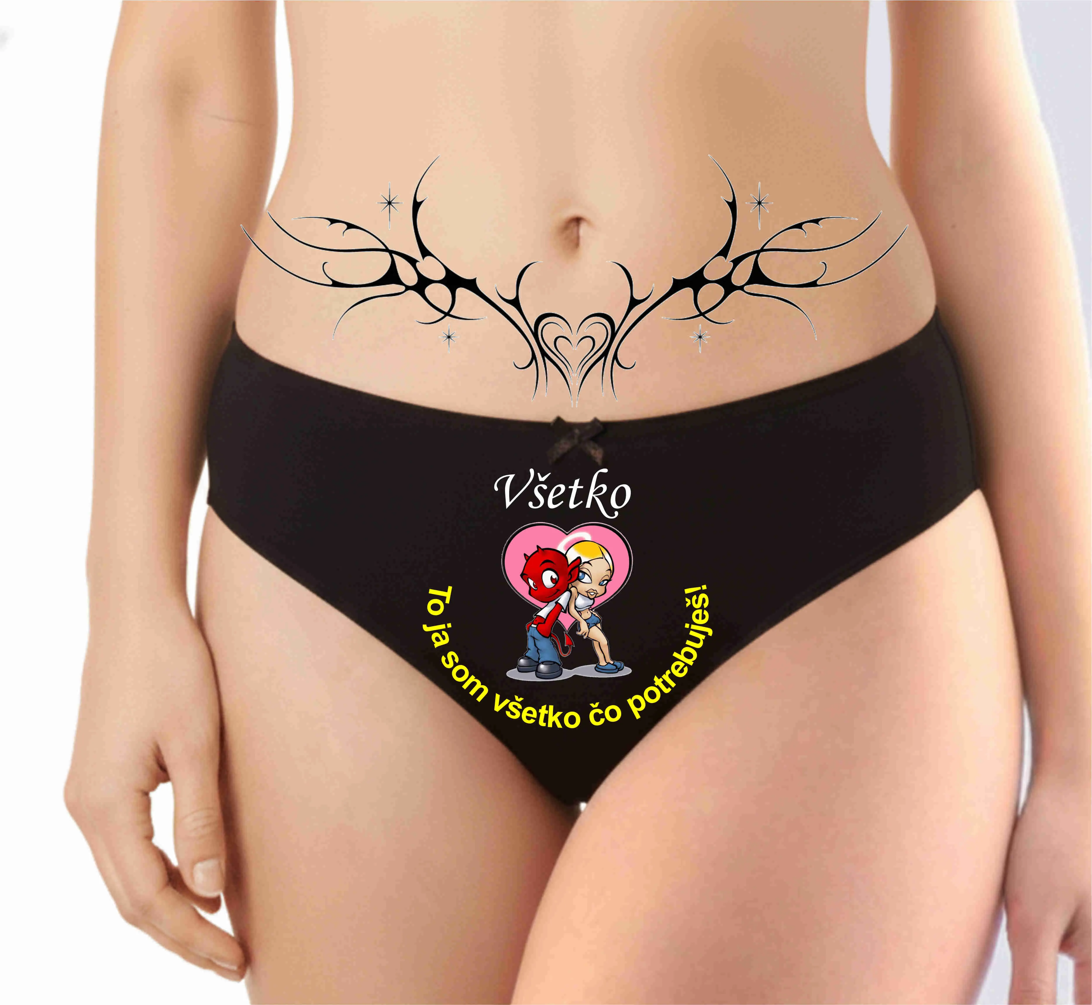 Pre ženy, ktoré vedia, čo chcú, a neboja sa to ukázať! Tieto čierne tangá sú dokonalou kombináciou zvodnosti a štipky humoru. Nápis „Všetko – to ja som všetko, čo potrebuješ“ je jasným odkazom pre vášho partnera, ktorý len podčiarkuje vašu jedinečnosť a sebaistotu.