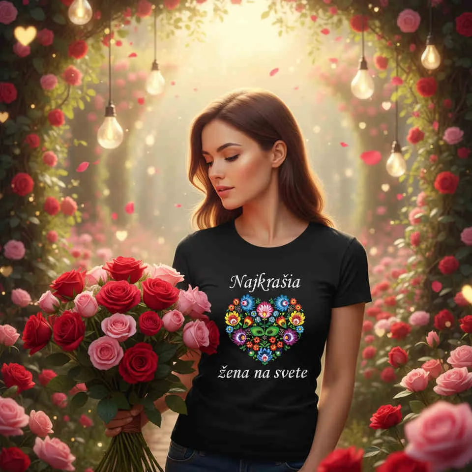 Povedzte to bez slov, alebo ešte lepšie – nápisom, ktorý si môže hrdo obliecť! Toto kvalitné čierne tričko v sebe spája úctu k tradíciám a ten najkrajší kompliment, aký môže žena dostať. Dominantou dizajnu je bohato zdobené folklórne srdce, ktoré symbolizuje lásku a našu kultúrnu identitu.