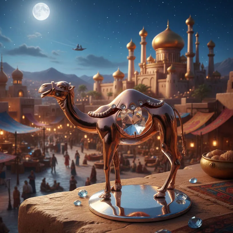Zdobenie sedla: Chrbát ťavy je zdobený dekoratívnym sedlom, do ktorého sú vsadené drobné číre kamienky, pripomínajúce luxusné orientálne výšivky.