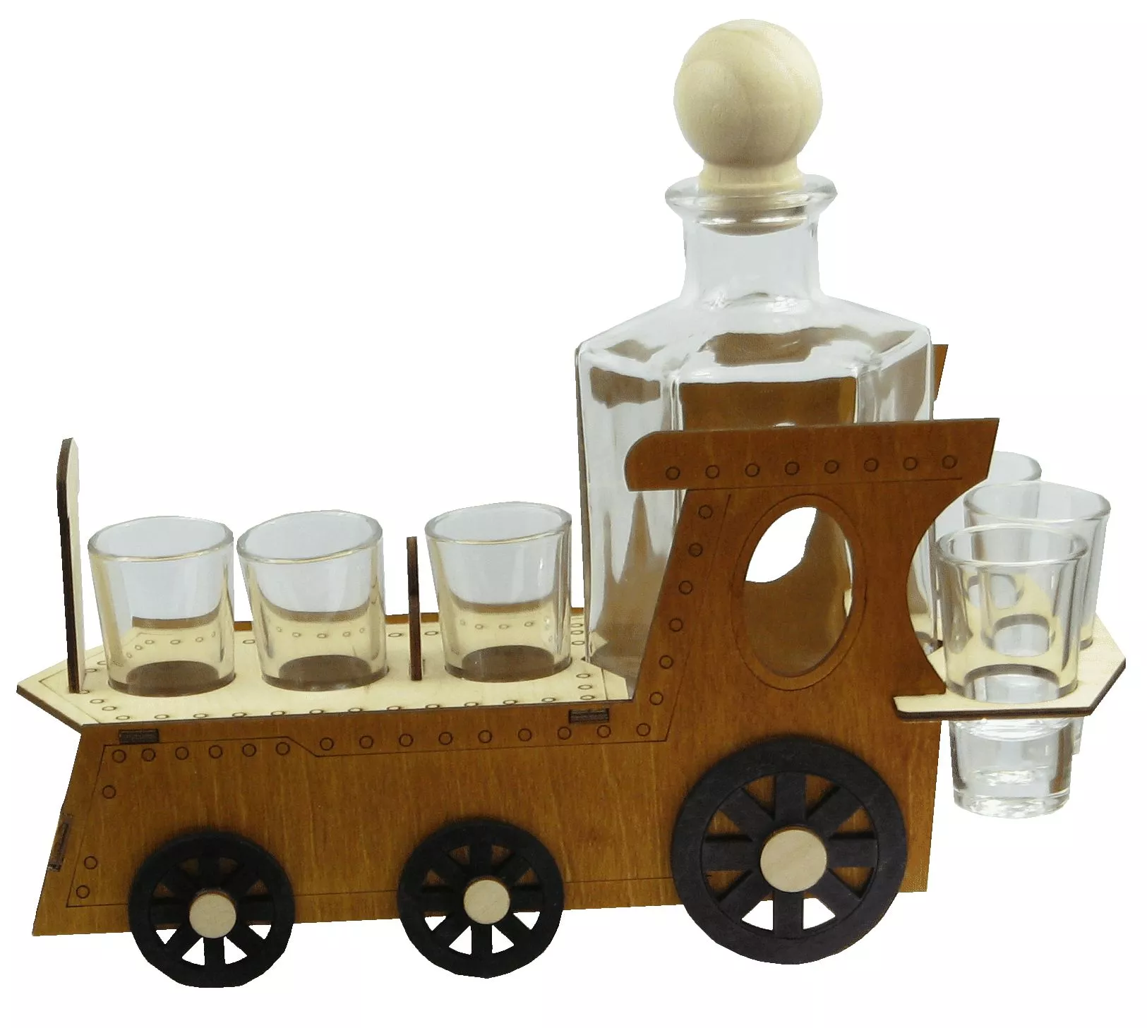 Stojan obsahuje sklenenú karafu a šesť sklenených pohárikov.