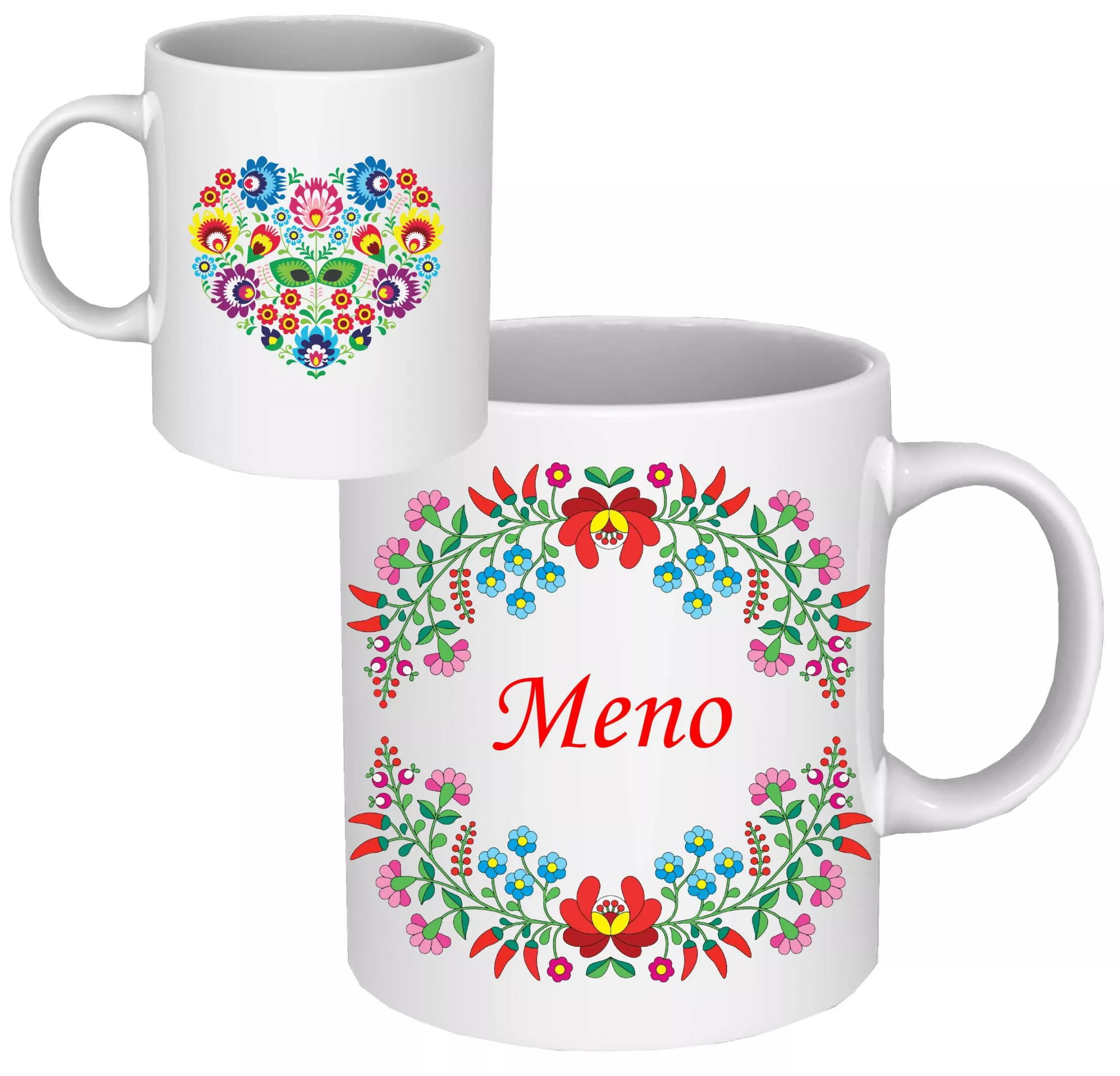 Hrnček bielej farby s nádherným folklórnymi dekoráciami a vzadu so srdiečkom z kvietkov.