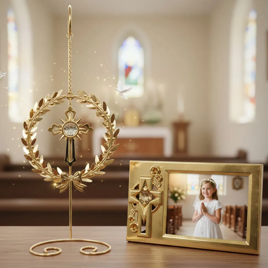 Hľadáte darček, ktorý v sebe spája hlbokú vieru, vznešenosť a špičkovú kvalitu? Táto nádherná pozlátená súprava s krištáľmi Swarovski je stvorená pre tie najvýznamnejšie životné okamihy. Kombinácia zlatého lesku a precízne brúsených krištáľov premení každý domov na miesto s duchovnou atmosférou a eleganciou.