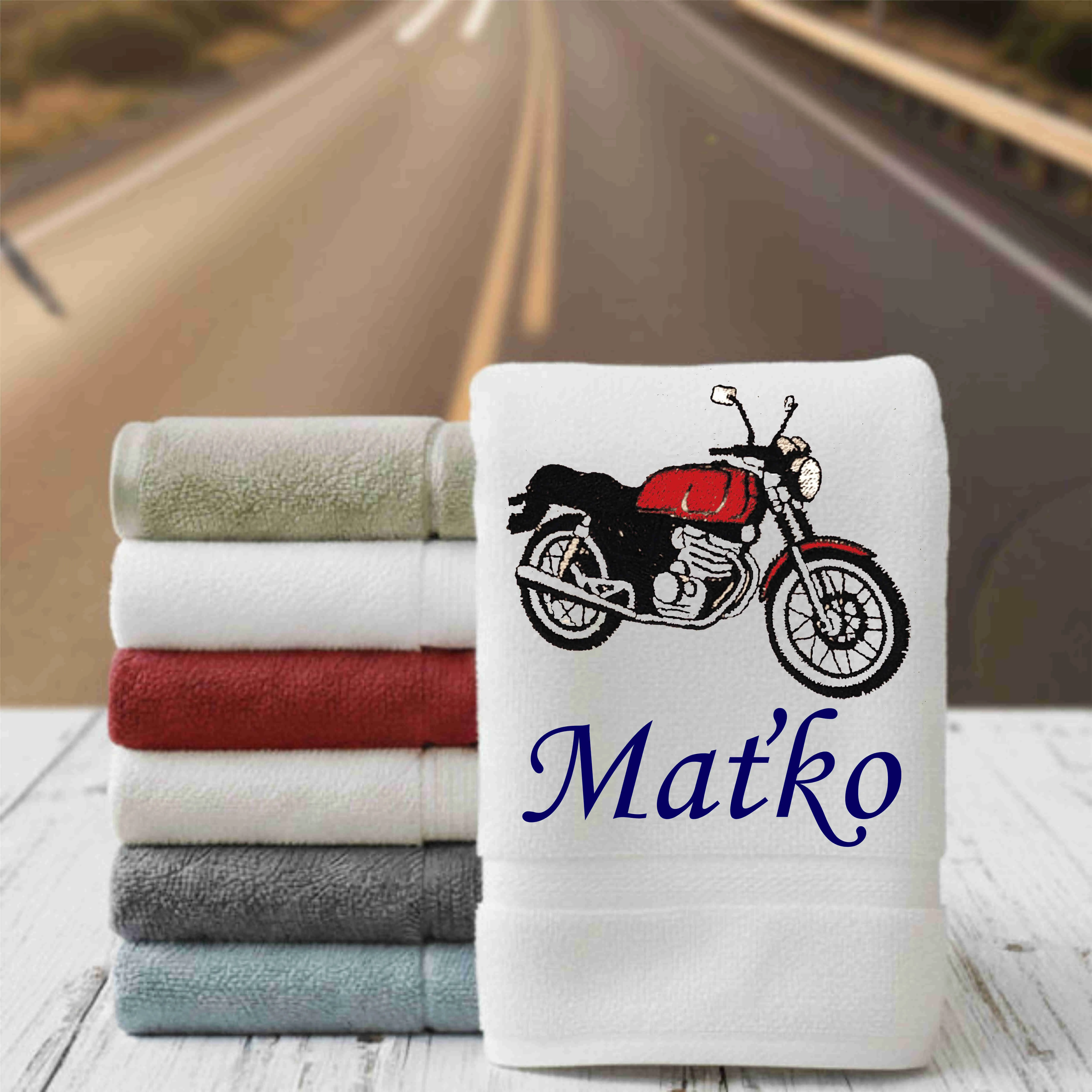 - Na osuške je vyšitá motorka + meno aké si želáte. Môžete si vybrať z množstva farebných kombinácii.