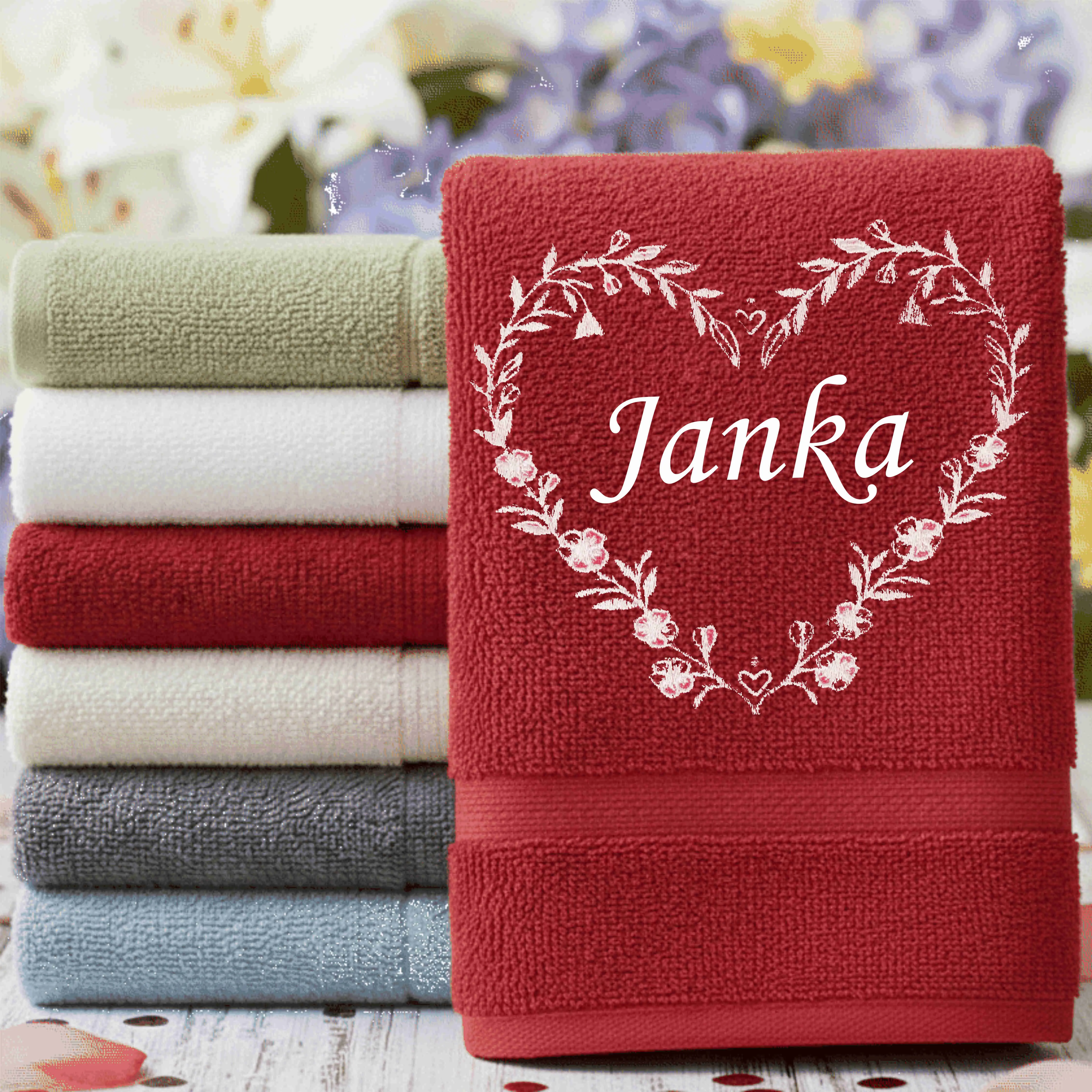 Na osuške je vyšité srdiečko a v ňom je menom, aké si želáte.
