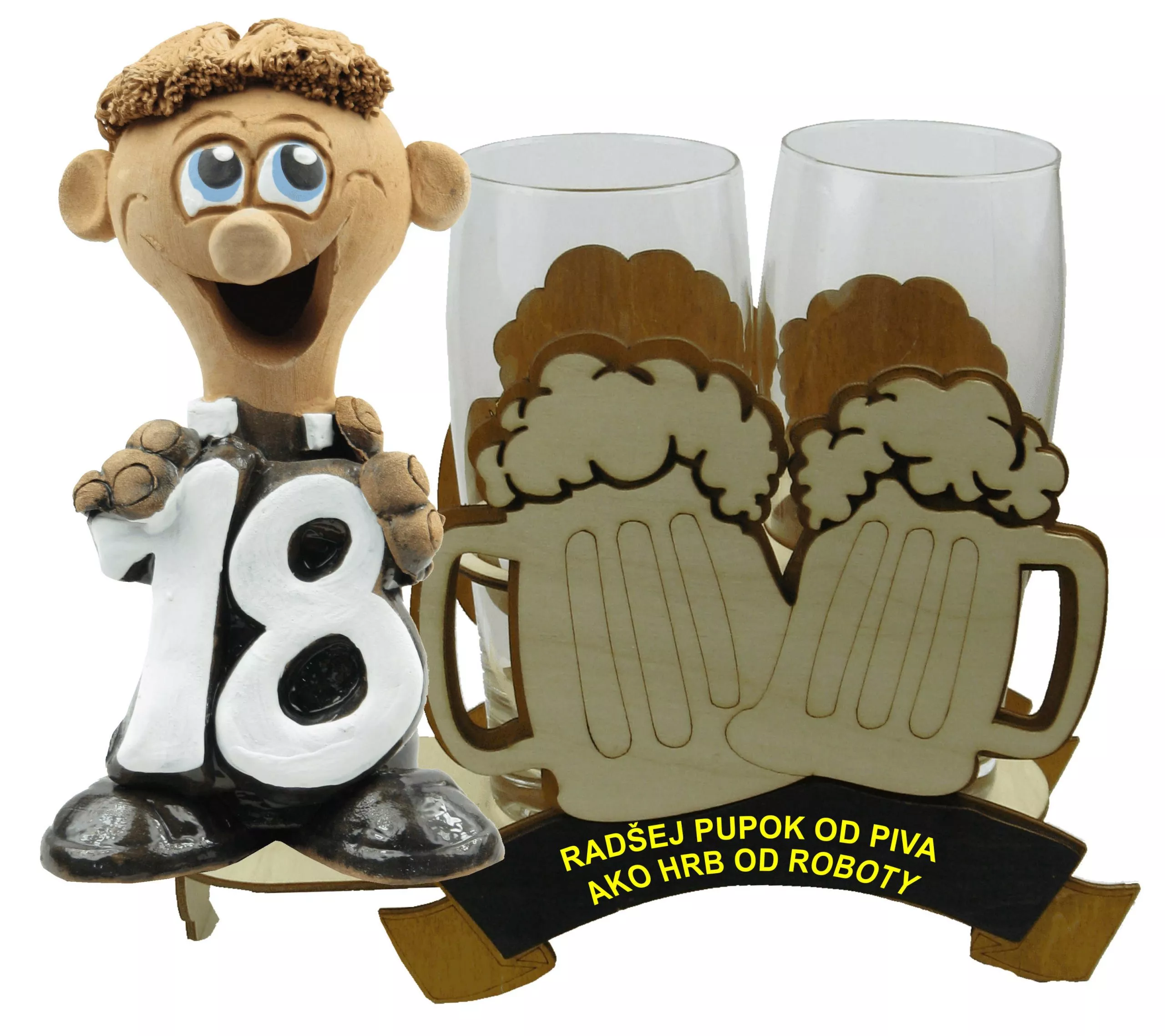 • Súčasťou dreveného stojana sú dva sklenené, 0,5l, pivné poháre a figúrka s výročným číslom podľa vlastného výberu.