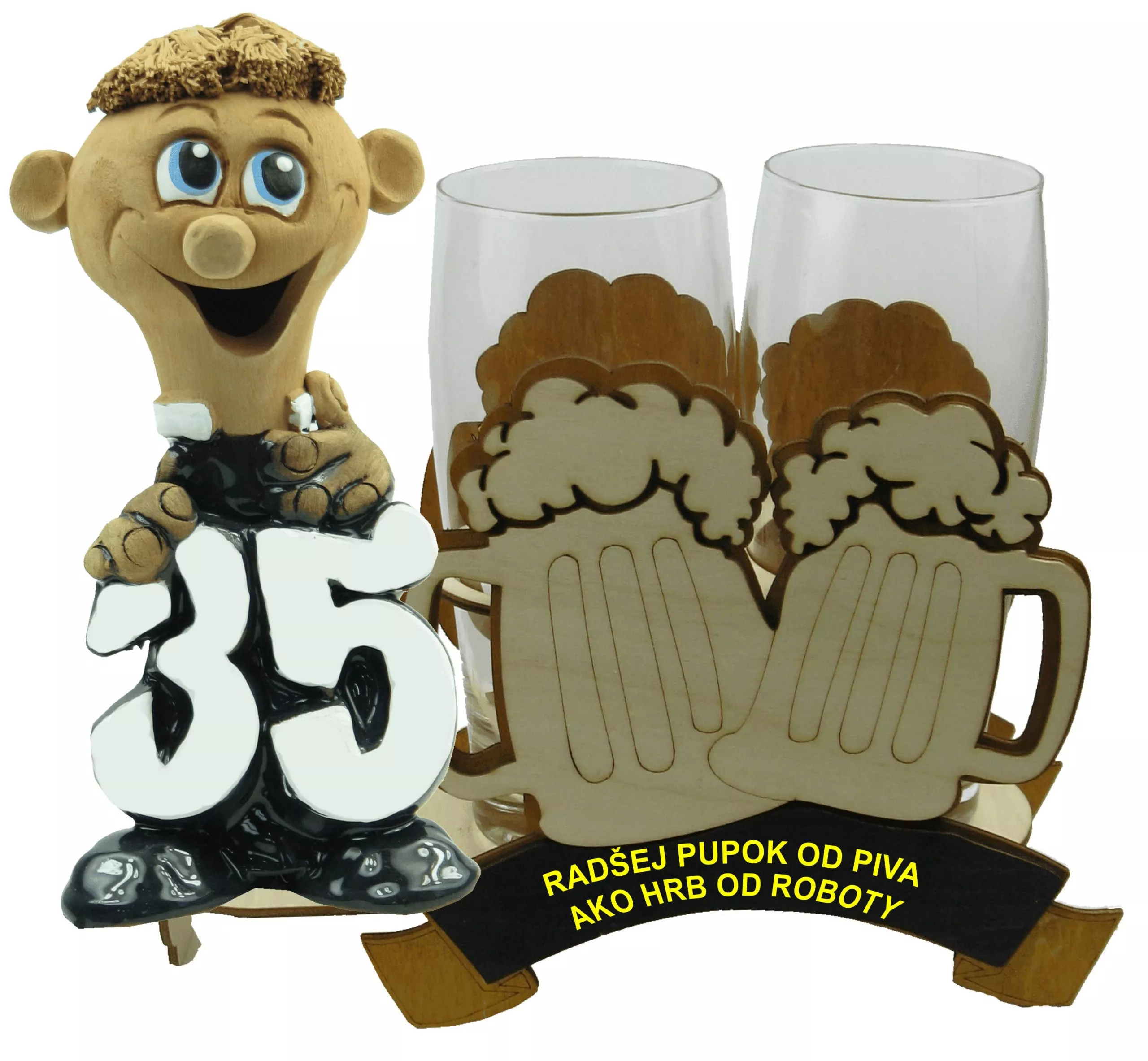 • Súčasťou dreveného stojana sú dva sklenené, 0,5l, pivné poháre a figúrka s výročným číslom podľa vlastného výberu.