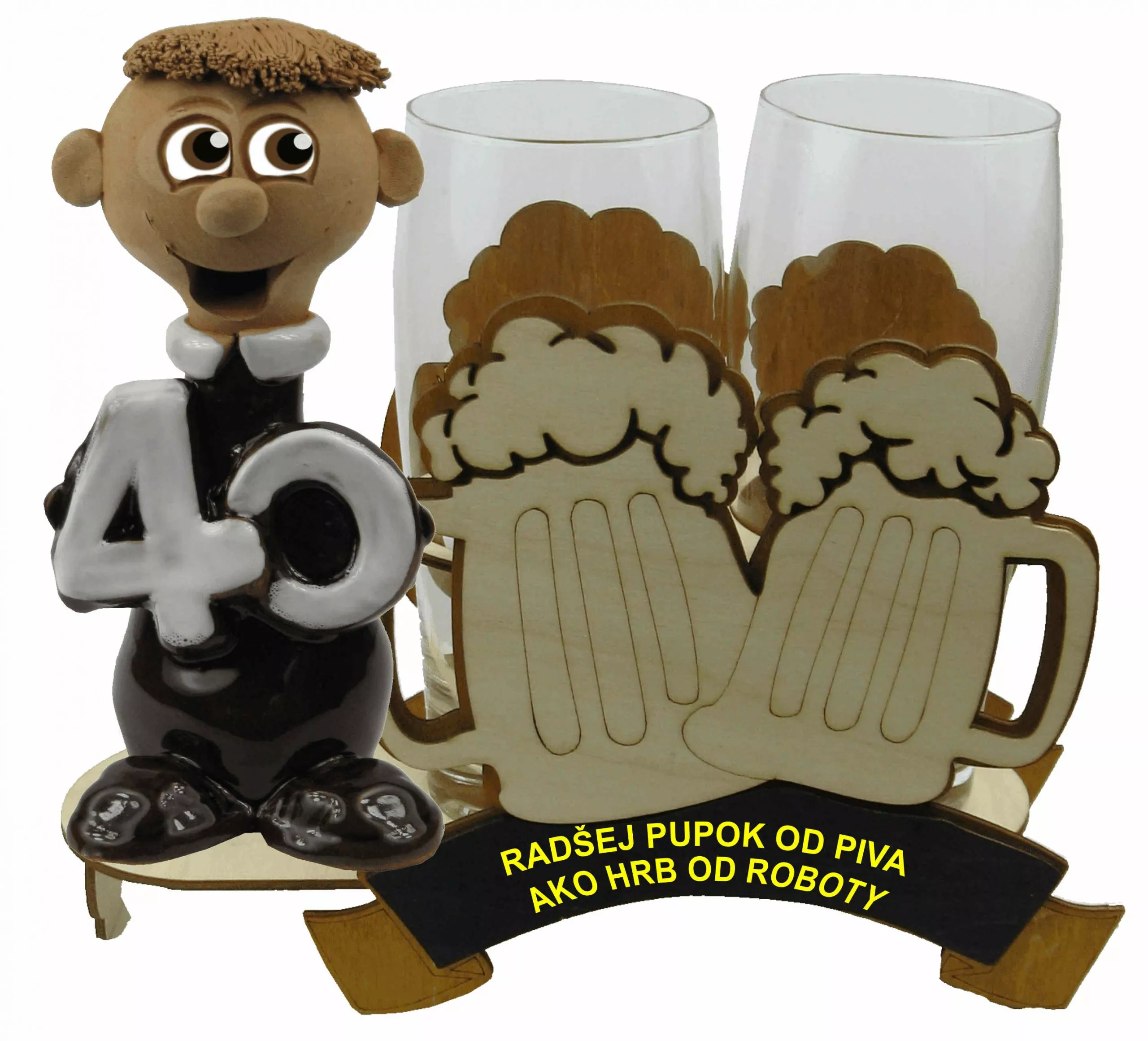 • Súčasťou dreveného stojana sú dva sklenené, 0,5l, pivné poháre a figúrka s výročným číslom podľa vlastného výberu.