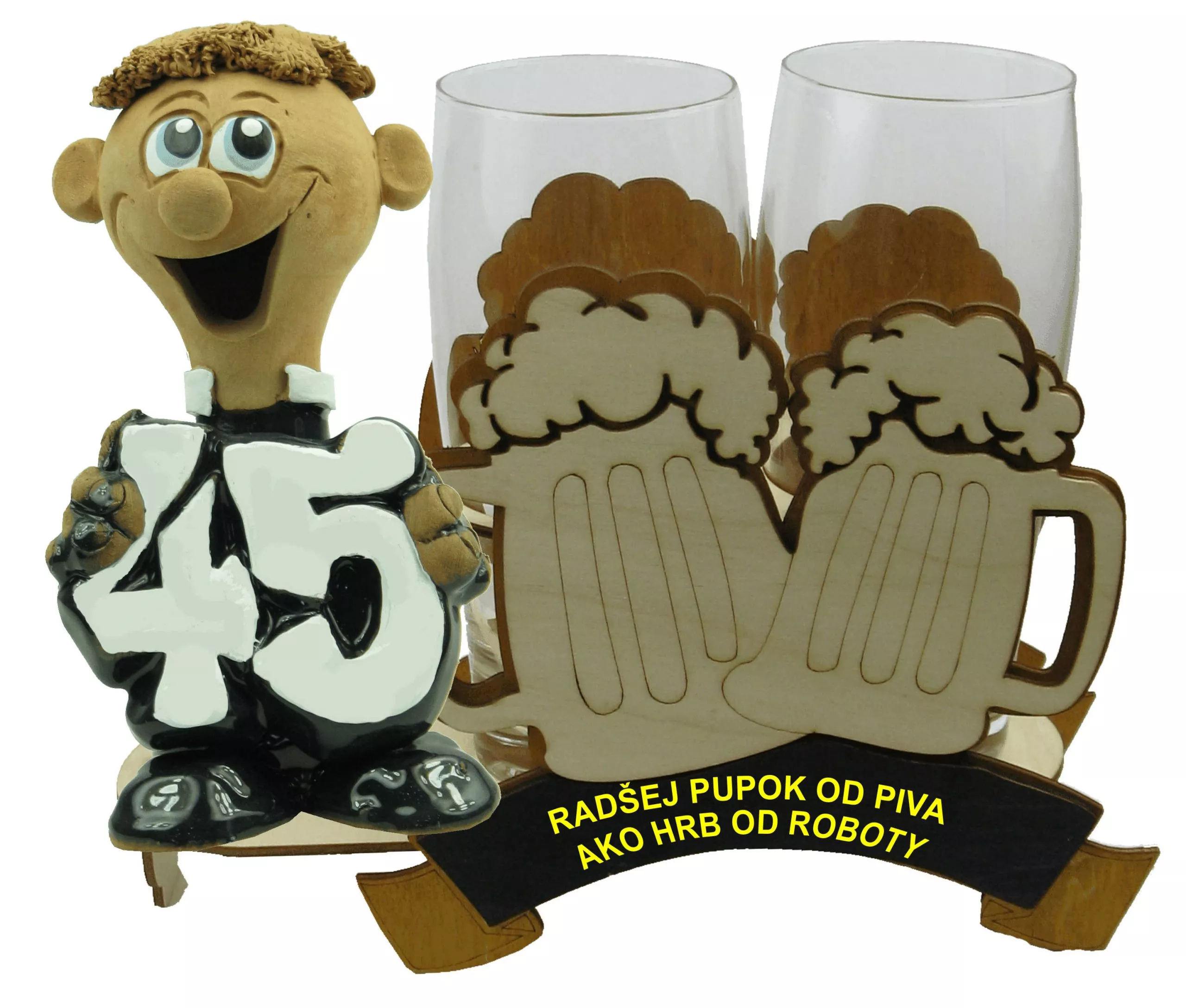 • Súčasťou dreveného stojana sú dva sklenené, 0,5l, pivné poháre a figúrka s výročným číslom podľa vlastného výberu.