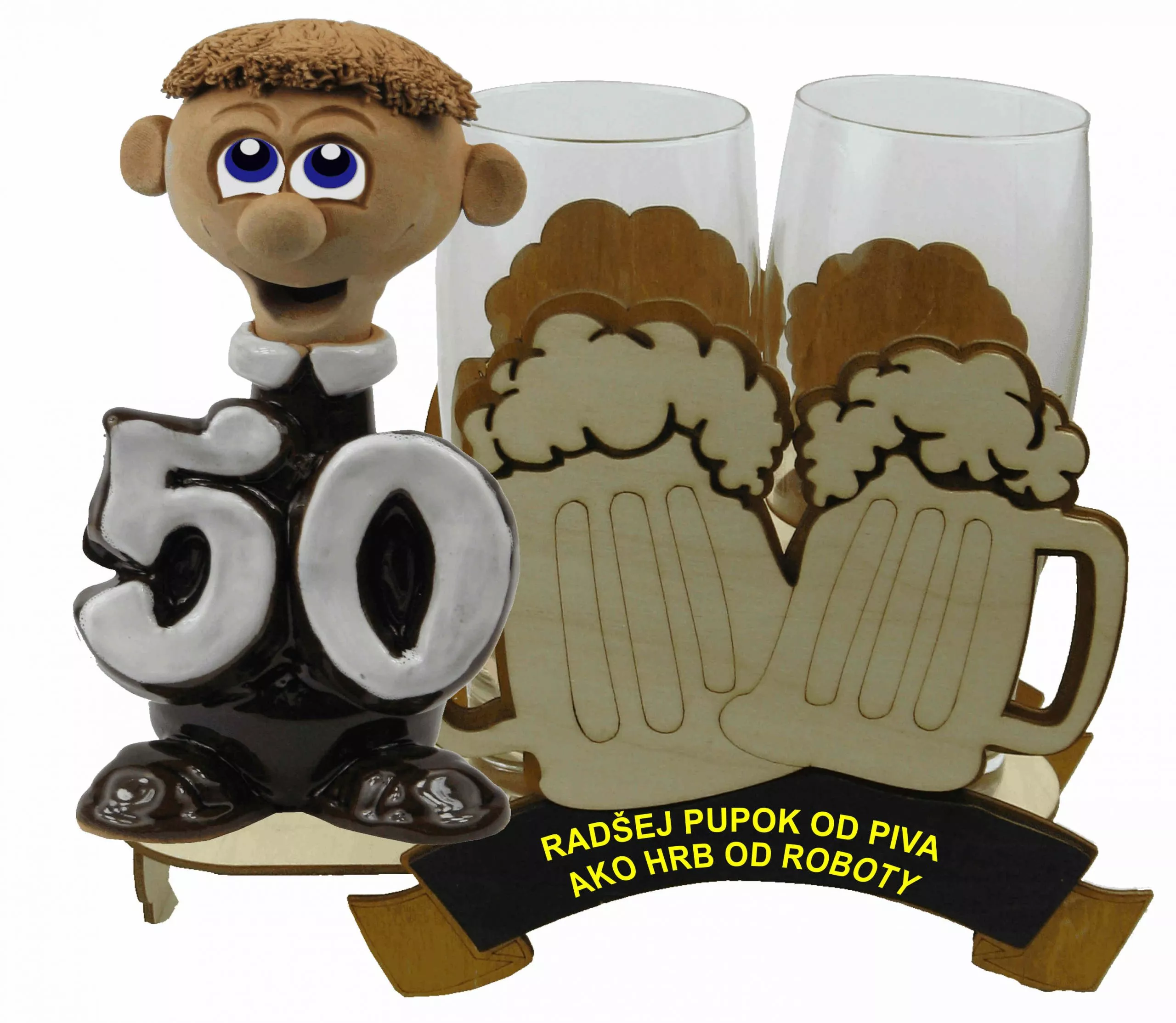 • Súčasťou dreveného stojana sú dva sklenené, 0,5l, pivné poháre a figúrka s výročným číslom podľa vlastného výberu.