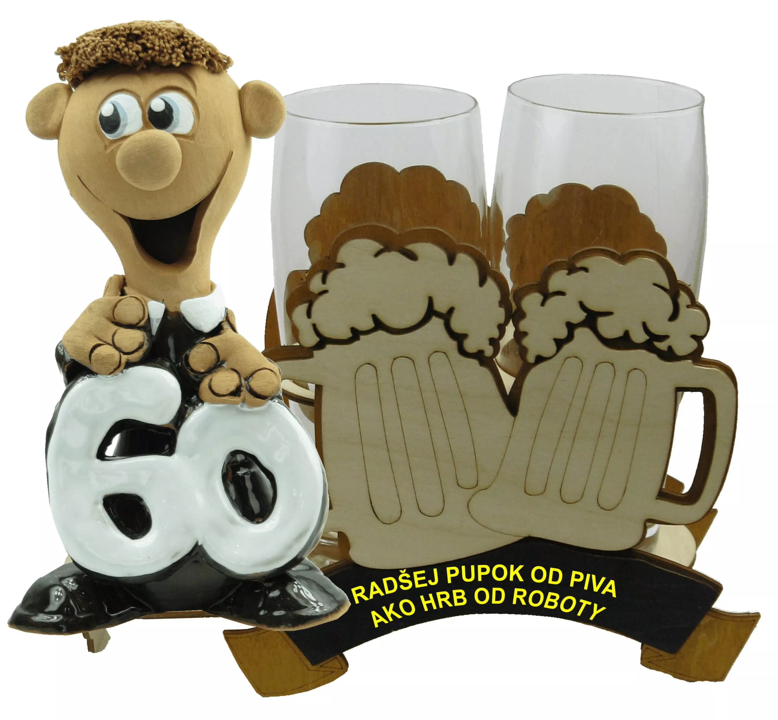 - Súčasťou dreveného stojana sú dva sklenené, 0,5l, pivné poháre a figúrka s výročným číslom podľa vlastného výberu.