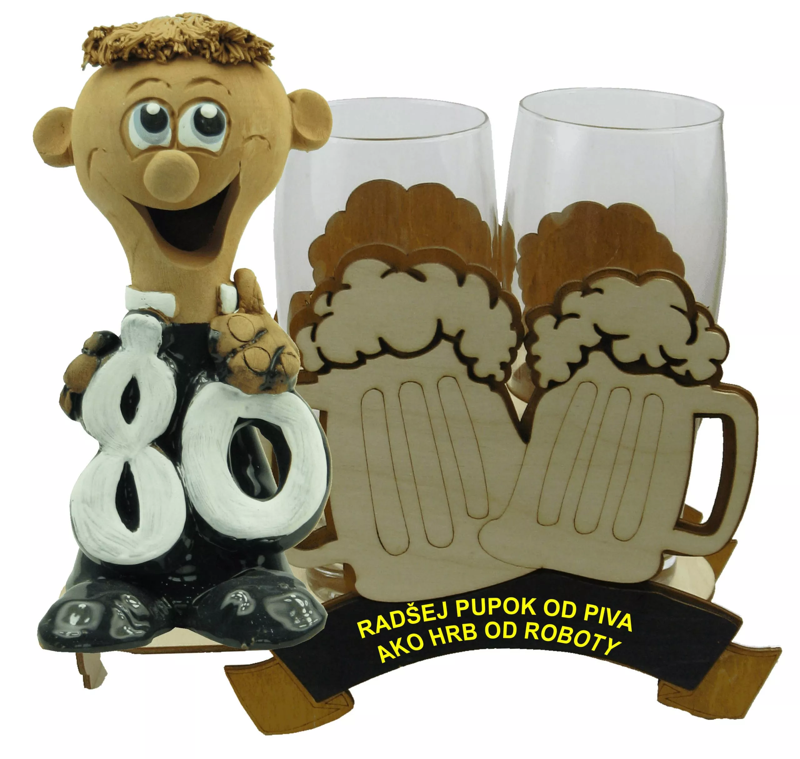 • Súčasťou dreveného stojana sú dva sklenené, 0,5l, pivné poháre a figúrka s výročným číslom podľa vlastného výberu.
