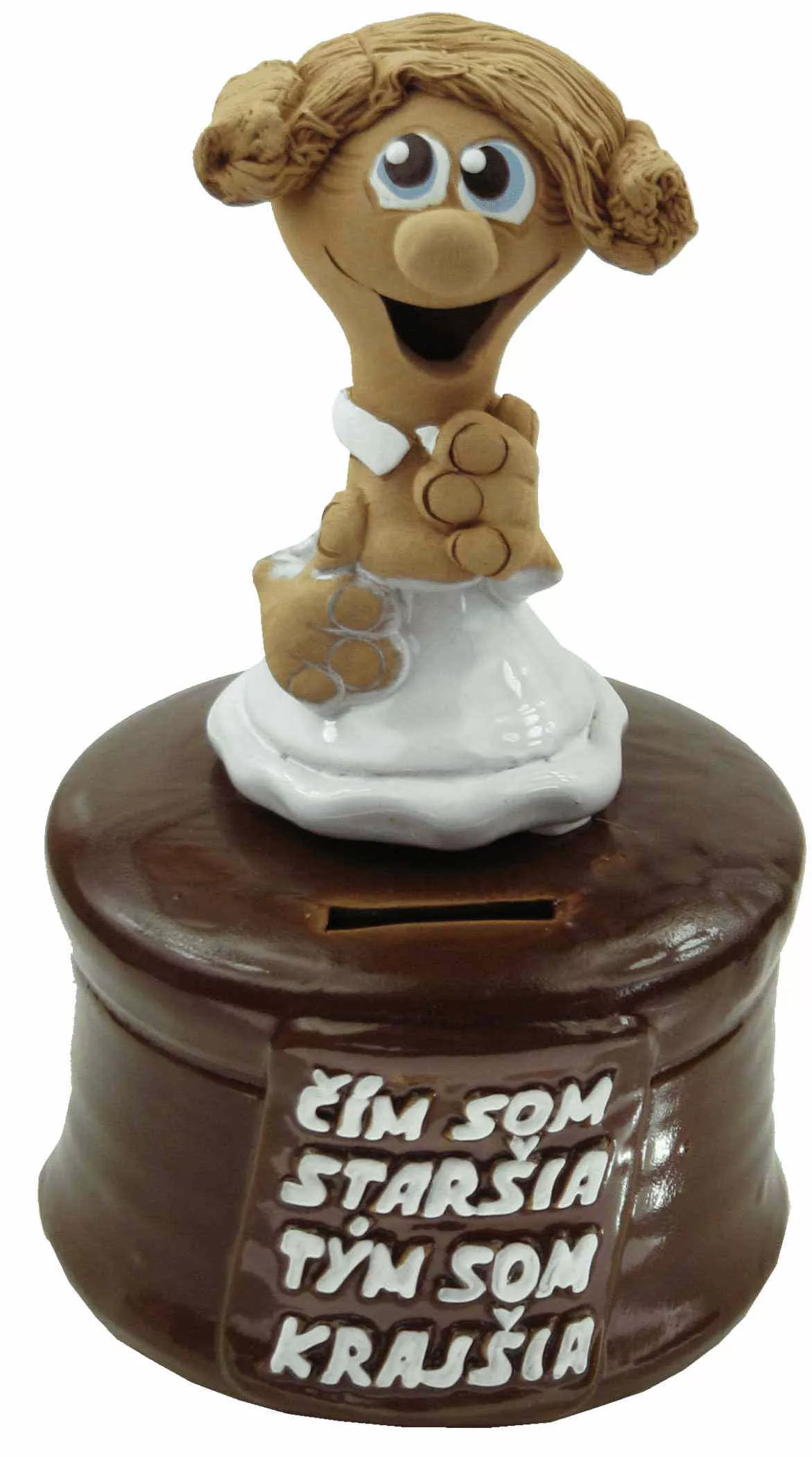 Figúrka má na podstavci nápis : čím som starší, tým som krajší, alebo čím som staršia, tým som krajšia. Hlinená pokladnička je určená pre všetkých mužov a ženy.