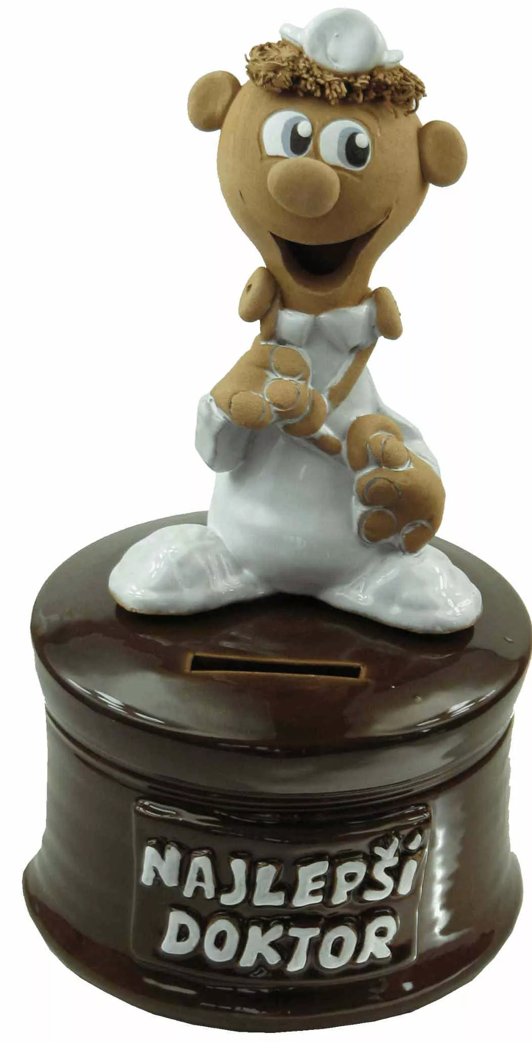 Figúrka má na podstavci nápis : najlepší doktor, alebo najlepšia doktorka. Hlinená pokladnička je určená pre našich zdravotníkov, lekárov a lekárky.