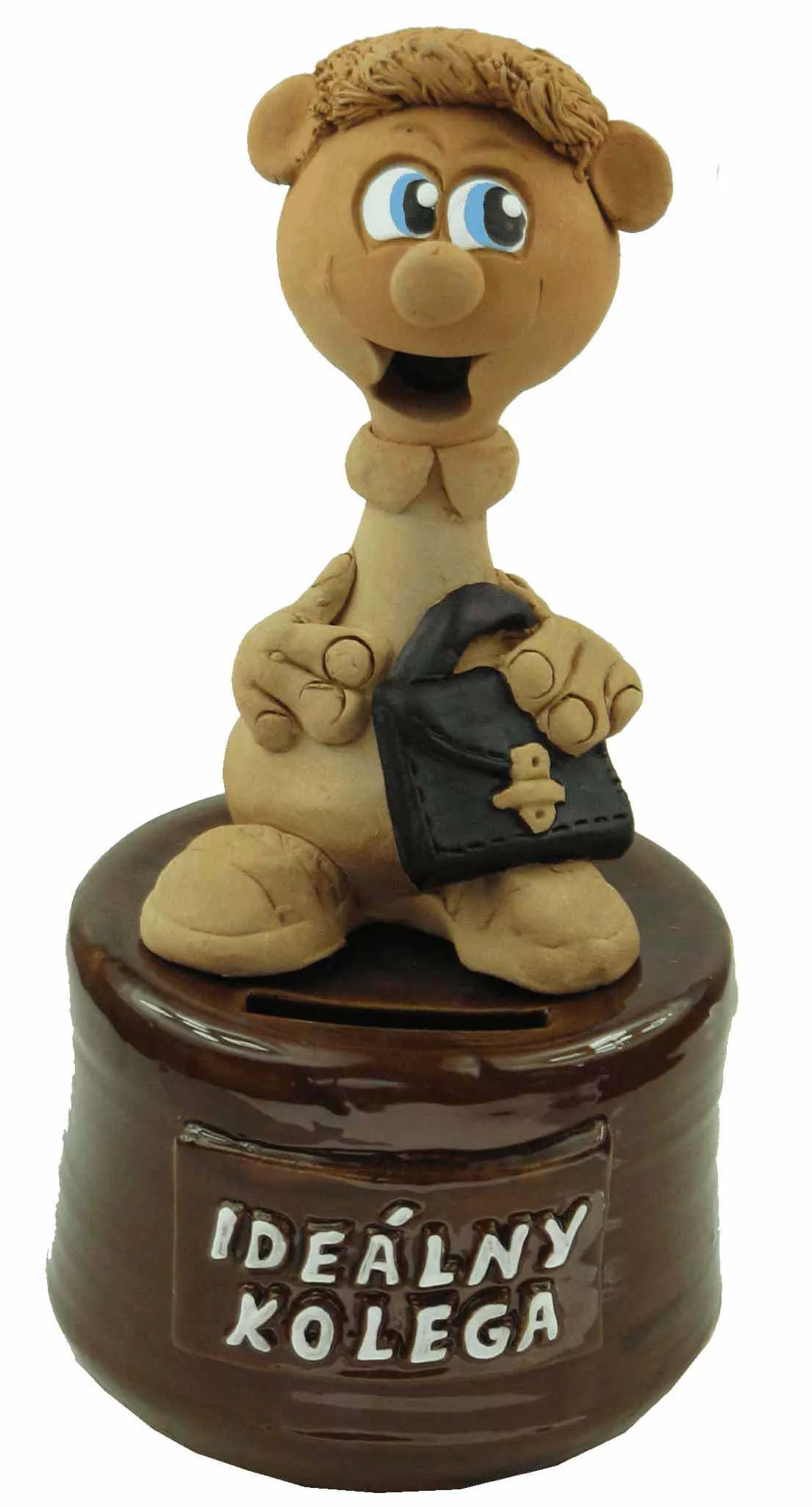 Figúrka má  na podstavci nápis : najlepší kolega, alebo najlepšia kolegyňa. Hlinená pokladnička je určená pre všetkých kolegov a kolegyne.