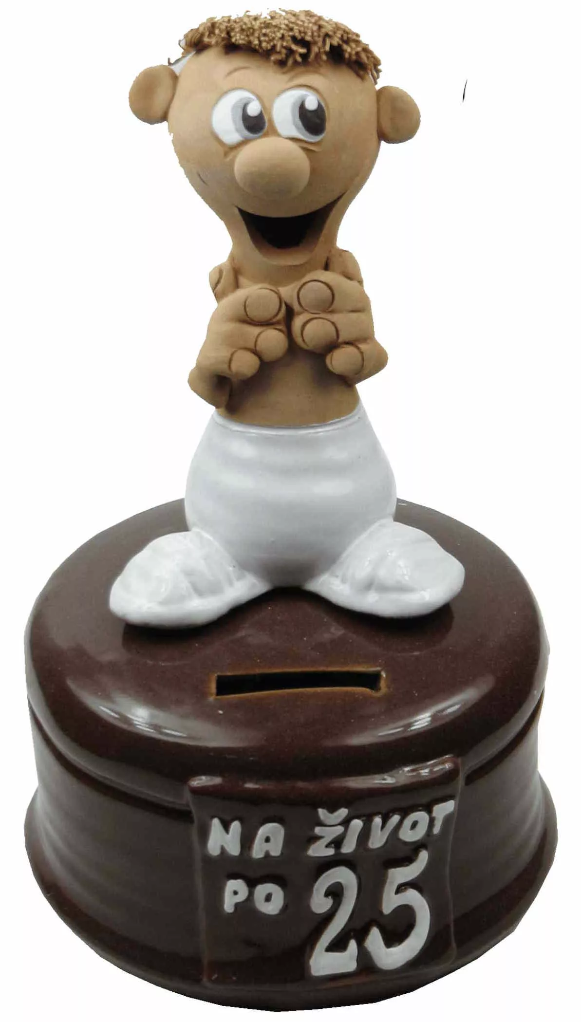 Figúrka má  na podstavci nápis : na život po... a výročné číslo, ktoré si vyberiete. Hlinená pokladnička je určená pre mužov a ženy k narodeninám.