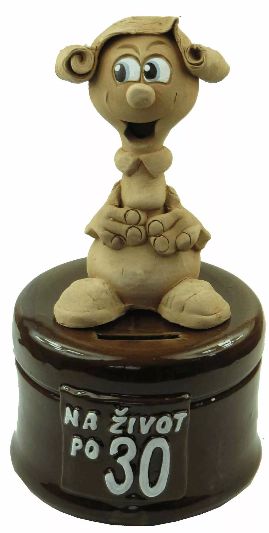 Figúrka má  na podstavci nápis : na život po... a výročné číslo, ktoré si vyberiete. Hlinená pokladnička je určená pre mužov a ženy k narodeninám.