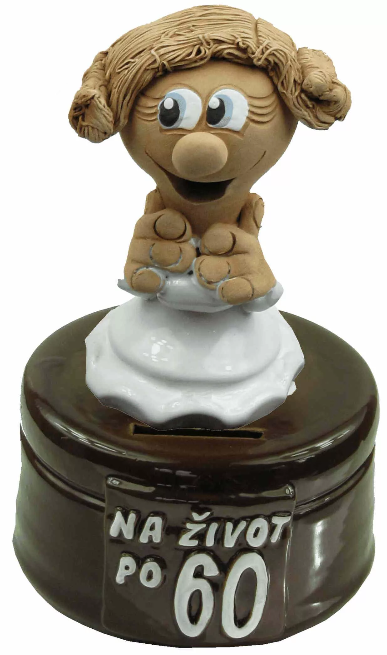 Figúrka má  na podstavci nápis : na život po... a výročné číslo, ktoré si vyberiete. Hlinená pokladnička je určená pre mužov a ženy k narodeninám.