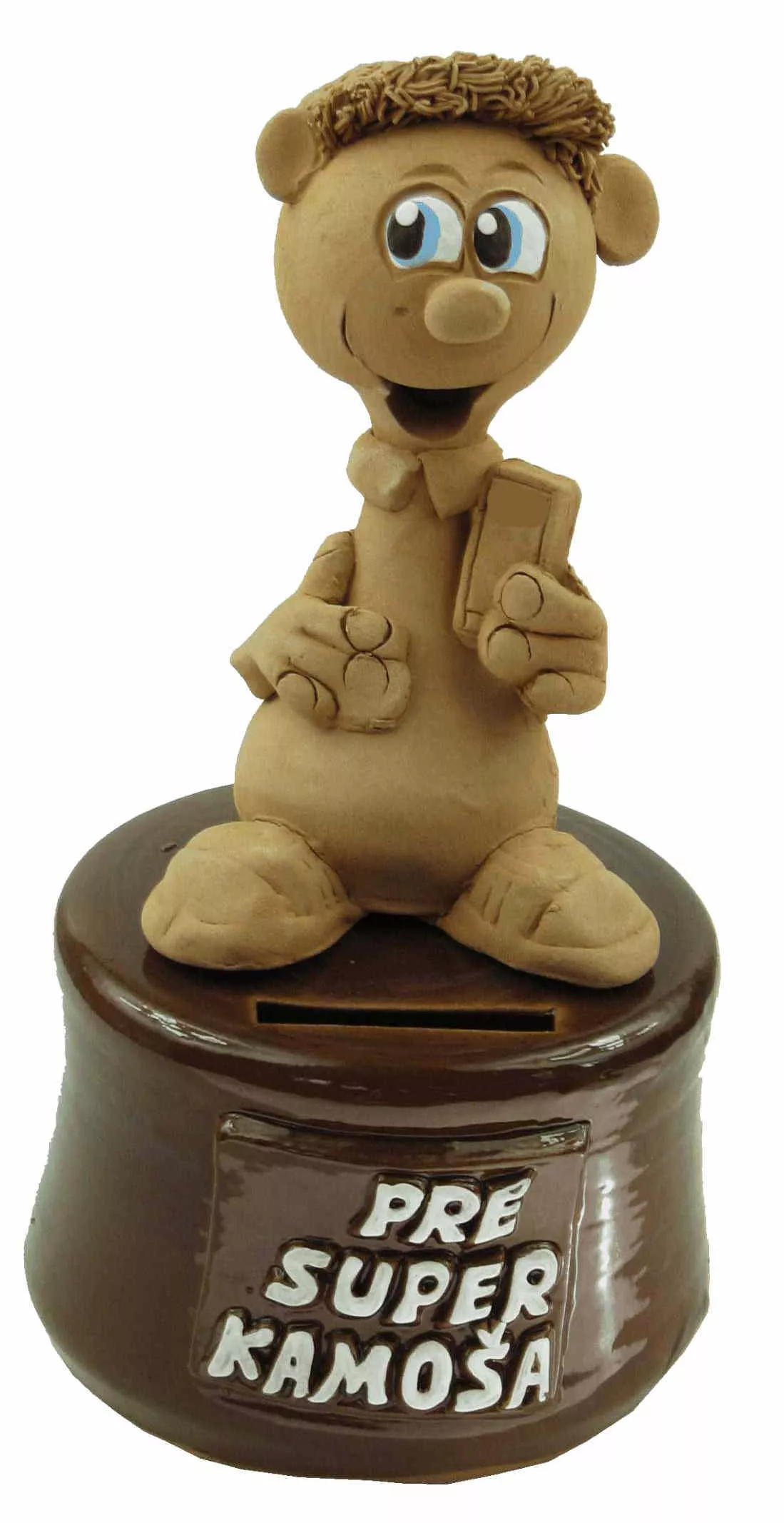 Figúrka má na podstavci nápis : pre super kamoša, pre super kamošku. Hlinená pokladnička je určená pre všetkých našich kamarátov a kamarátky.
