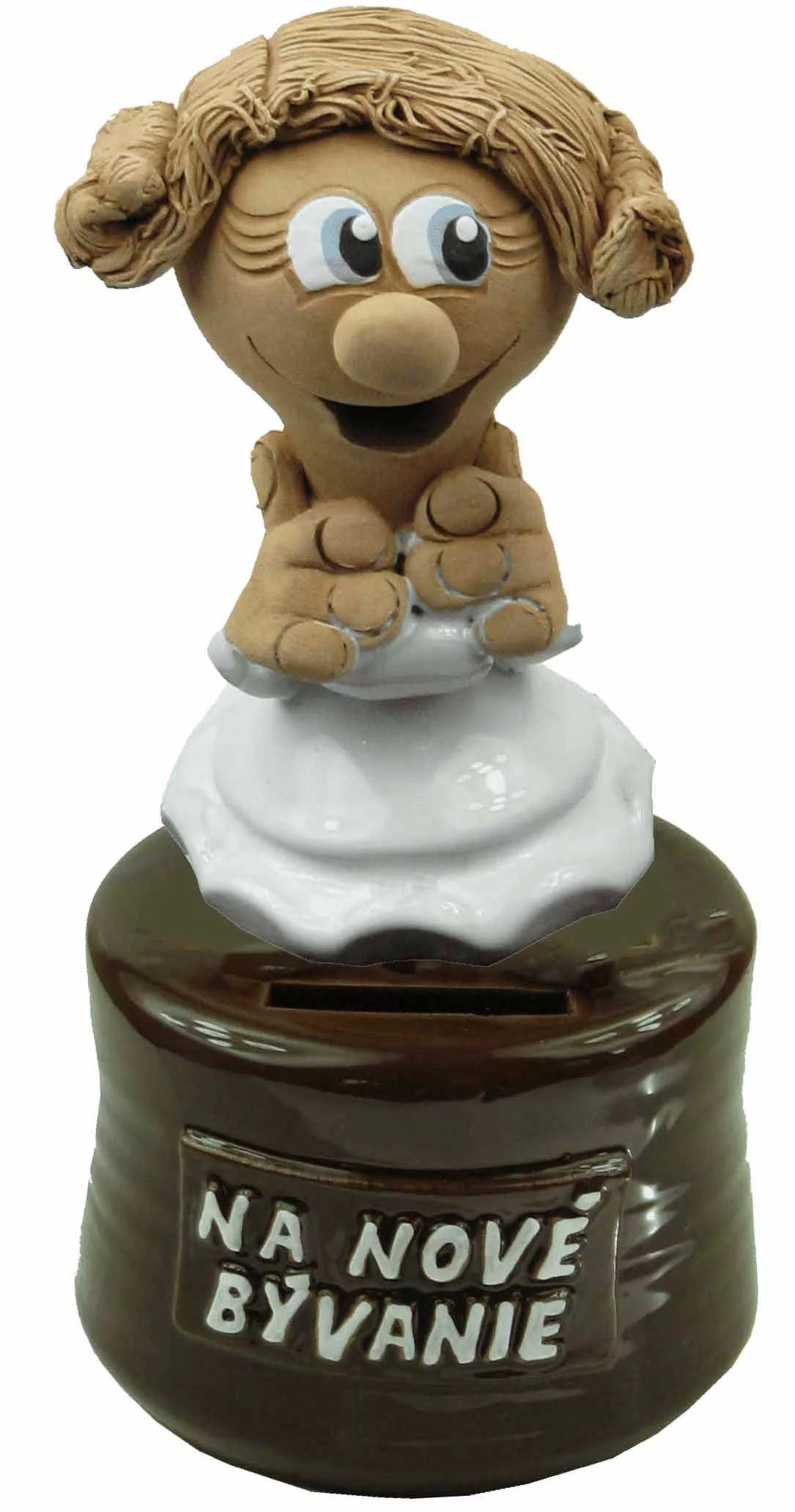 Figúrka má na podstavci nápis : na nové bývanie. Hlinená pokladnička je určená pre všetkých, ktorí si šetria na nový dom, alebo byt.