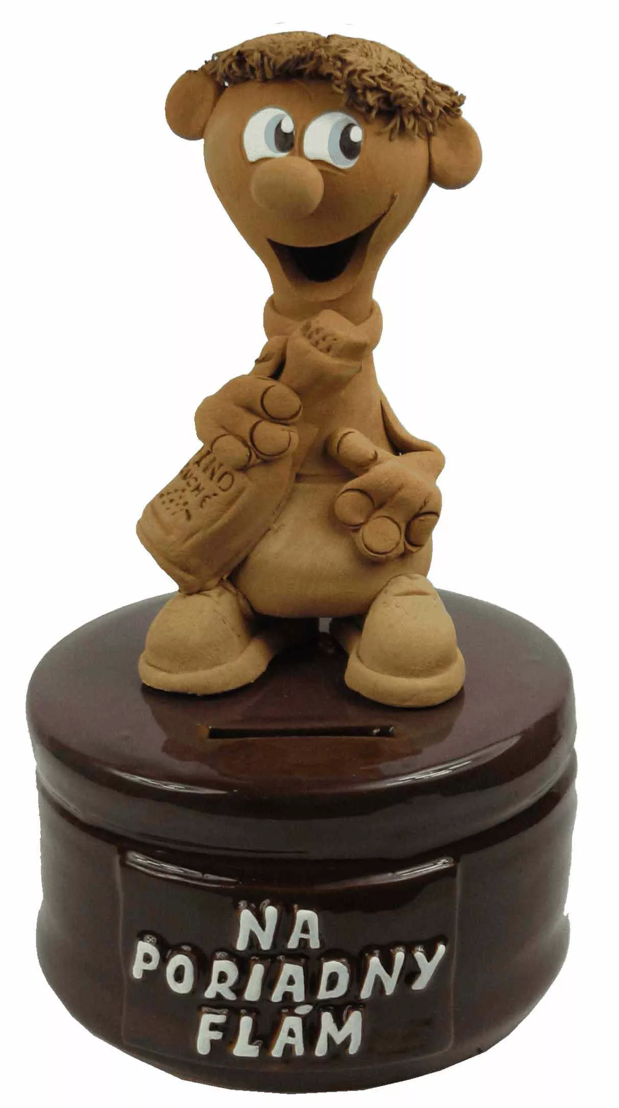 Figúrka má v ruke fľašu a na podstavci nápis : na poriadny flám. Hlinená pokladnička je určená pre všetkých, ktorým sa blíži deň veľkej oslavy.