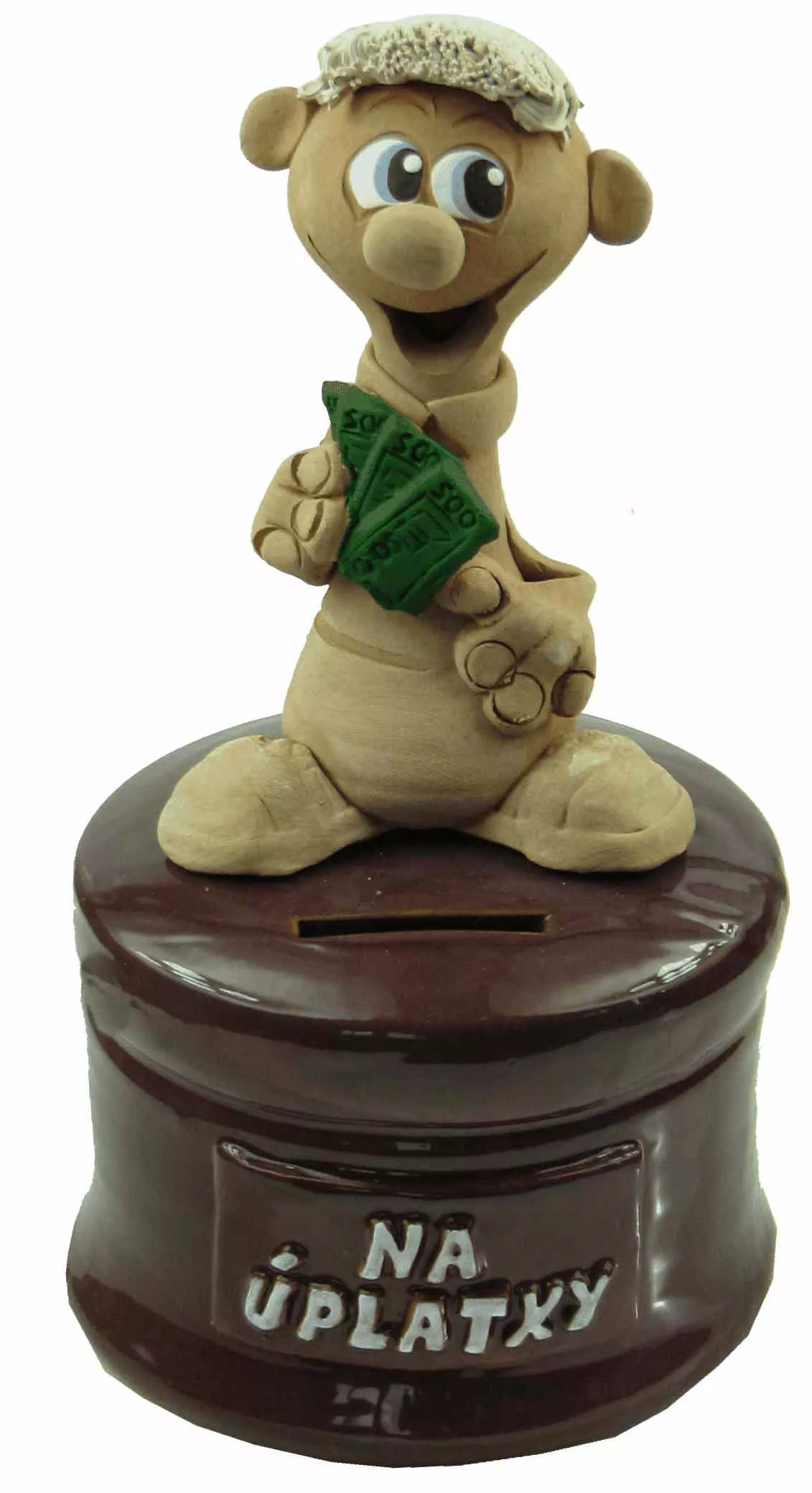 - Figúrka má v ruke peniaze a na podstavci nápis : na úplatky! Hlinená pokladnička vtipne odzrkadľuje dnešný stav spoločnosti, kde úplatky sú ešte stále jej bežnou súčasťou.