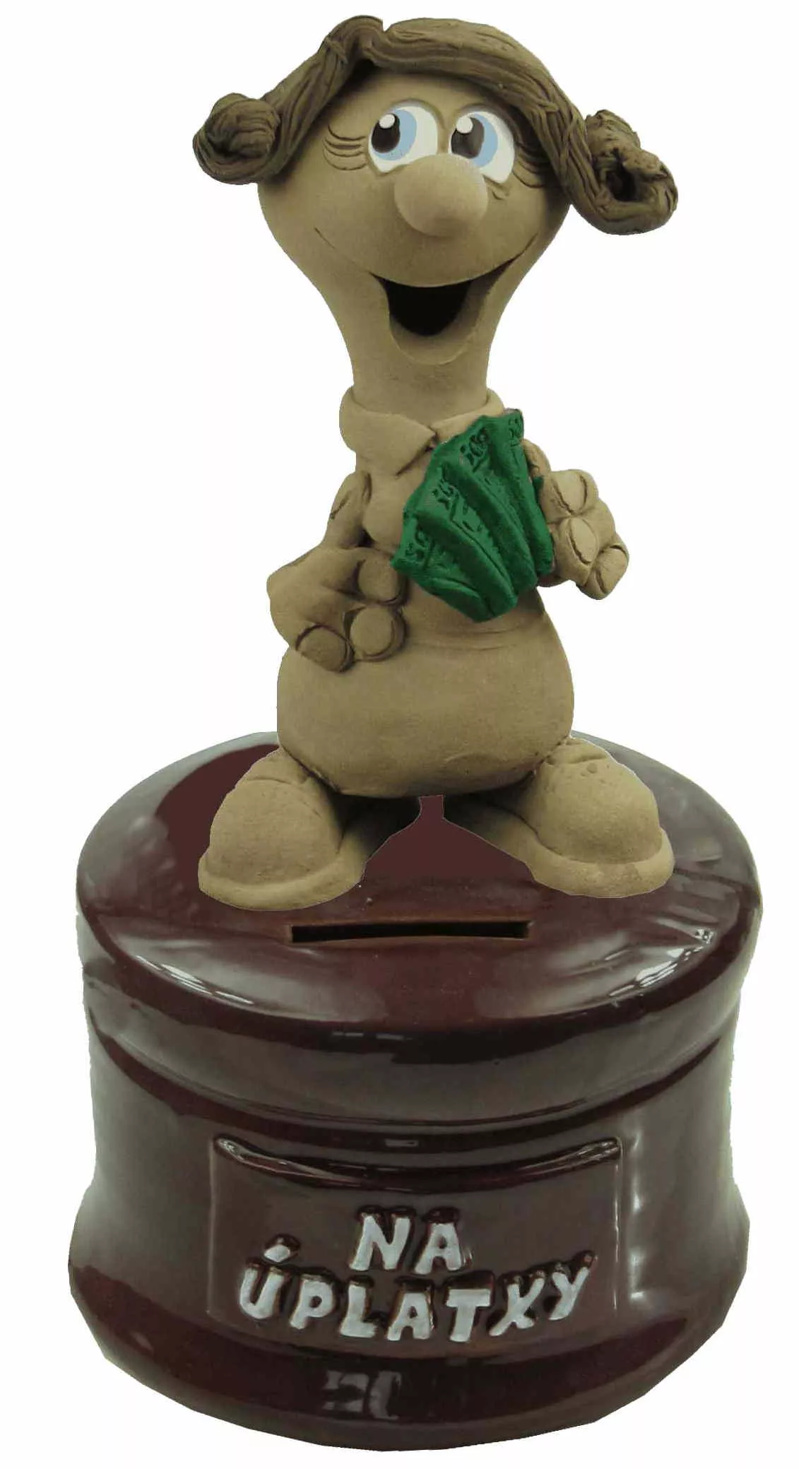 • Figúrka má v ruke peniaze a na podstavci nápis : na úplatky! Hlinená pokladnička vtipne odzrkadľuje dnešný stav spoločnosti, kde úplatky sú ešte stále jej bežnou súčasťou.