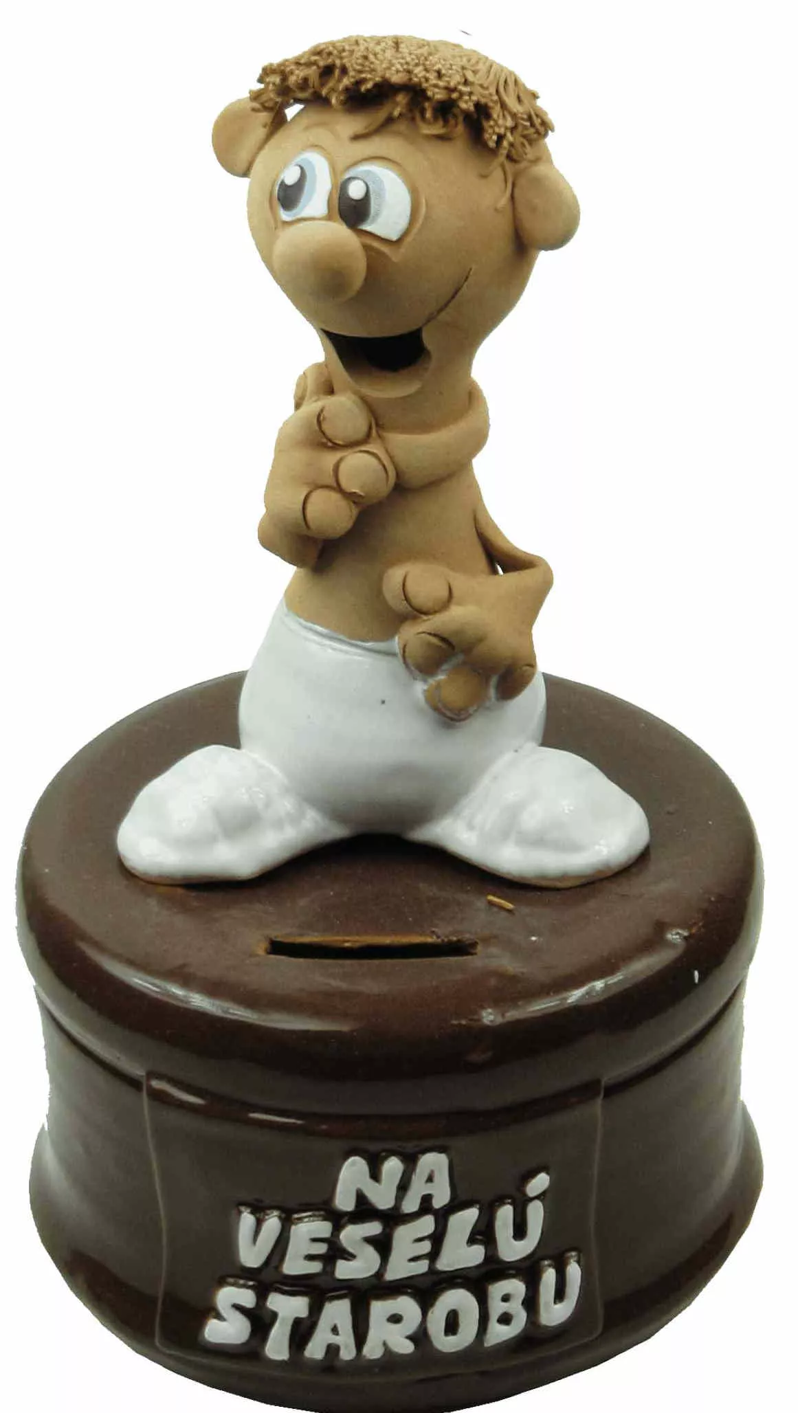 Figúrka má na podstavci nápis : na veselú starobu. Hlinená pokladnička je určená pre našich dedkov, babky, starých rodičov, alebo kolegov, či známych pri odchode do dôchodku.