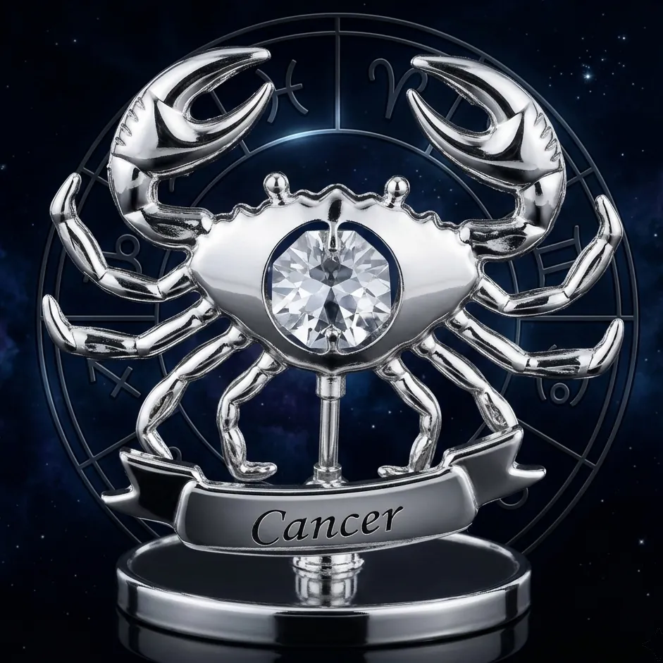 Prepracovaný dizajn: Detailne vypracované klepetá a pancier kraba sú osadené na elegantnom kruhovom podstavci s nápisom „Cancer“.