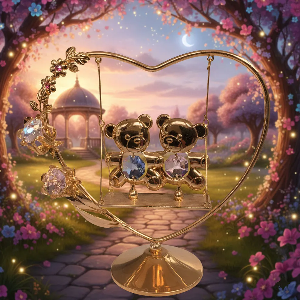 Hľadáte darček, ktorý vyjadrí lásku a nehu bez slov? Táto očarujúca stolová dekorácia zachytáva dvoch roztomilých medvedíkov na hojdačke, umiestnených v jemnom ráme v tvare srdca. Celý model je vyrobený z kvalitného kovu a pozlátený 24-karátovým zlatom, čo z neho robí luxusný interiérový doplnok s trvácnou hodnotou.