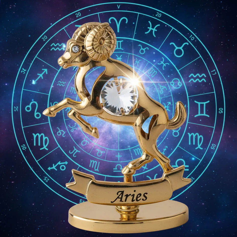 Umelecké spracovanie: Baran je zobrazený v dynamickom postoji na ozdobnom podstavci s nápisom „Aries“, čo vyjadruje jeho prirodzenú dravosť a vodcovstvo.
