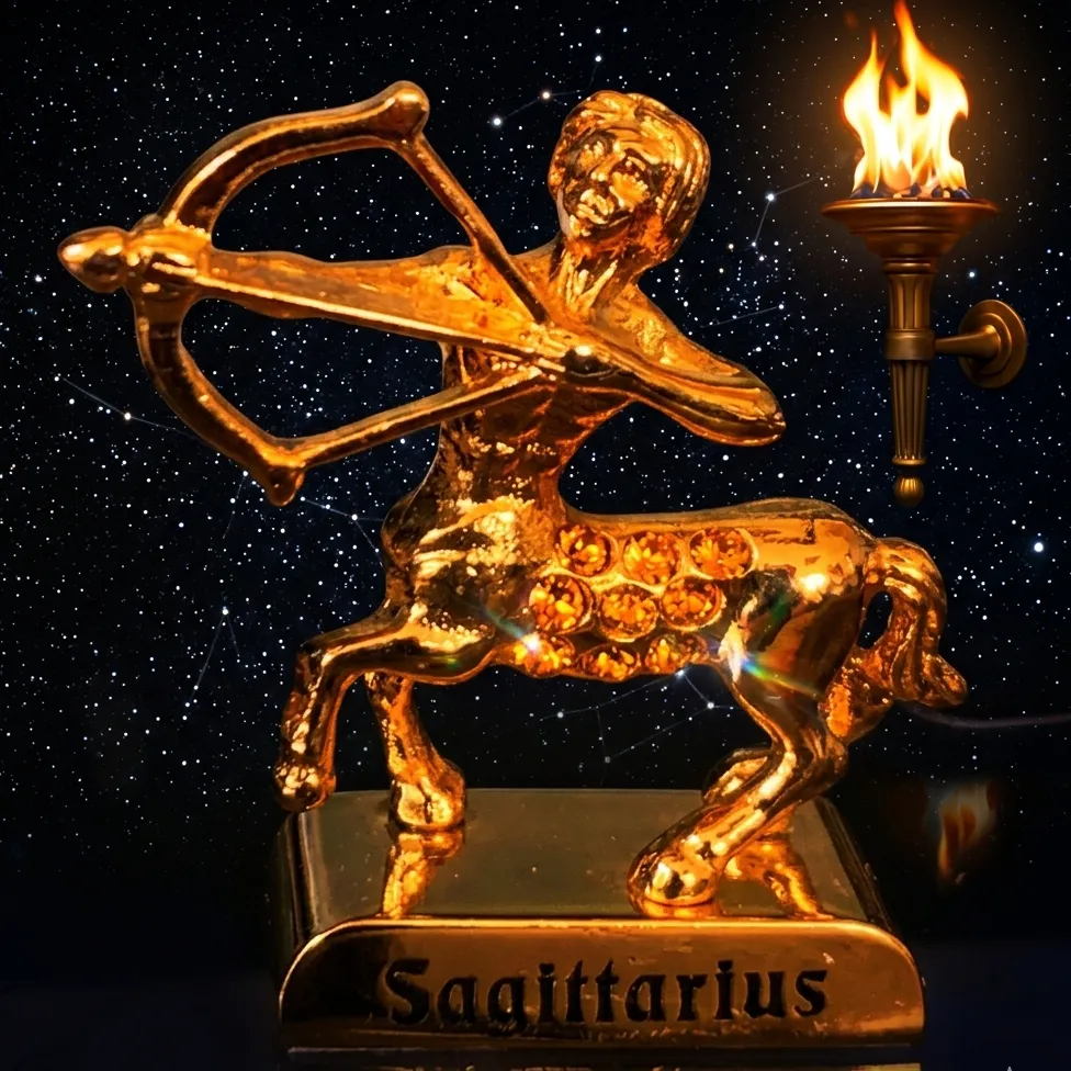 Stabilný podstavec: Figúrka stojí na pevnej zlatej základni s jasne čitateľným nápisom „Sagittarius“.