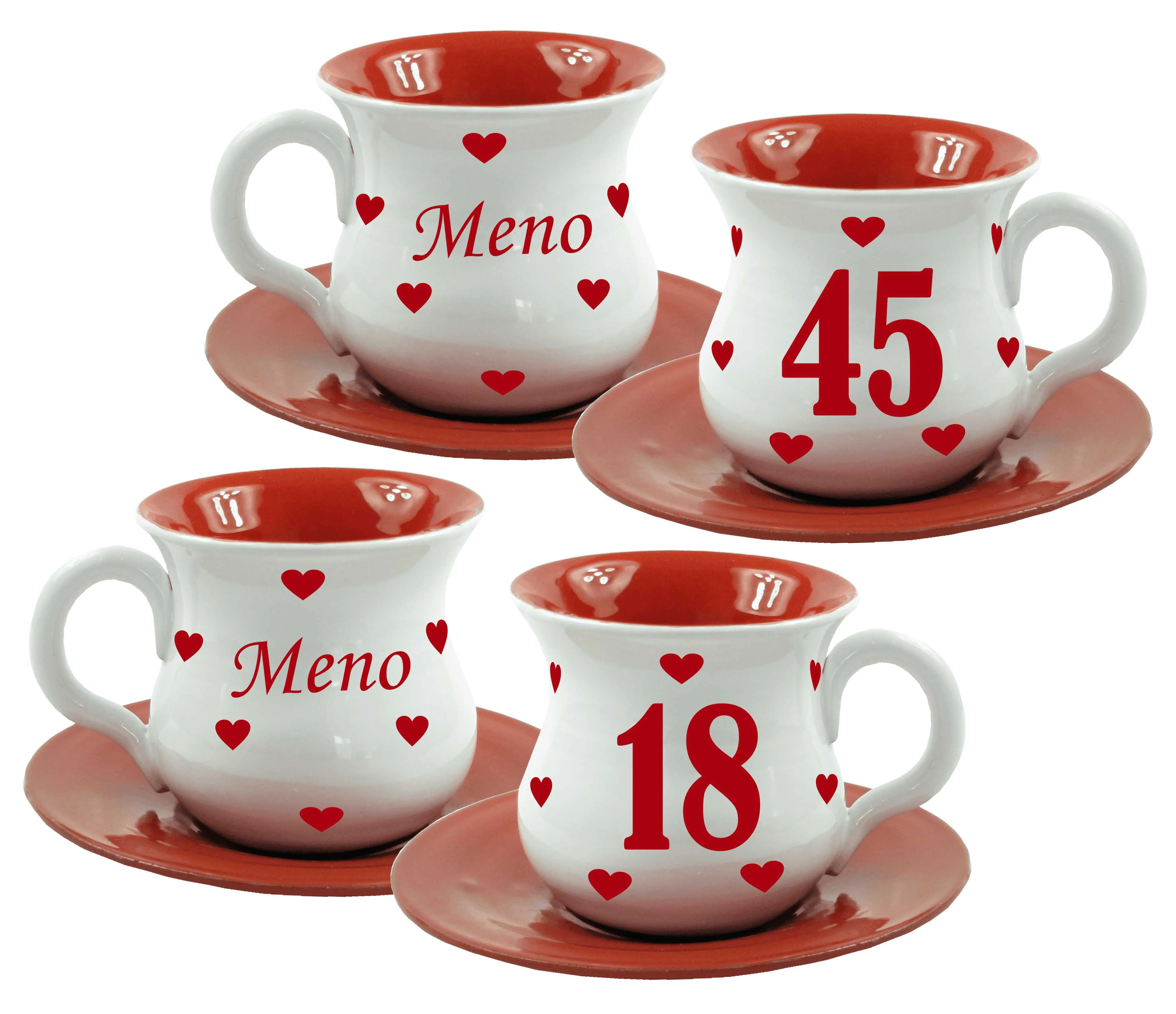 Keramická šálka je ručne vyrábaná. Naglazovaná je červenou a bielou glazúrou s červenými srdiečkami. Šálky sú o objeme cca 200ml. Meno vyrobíme aké si želáte.