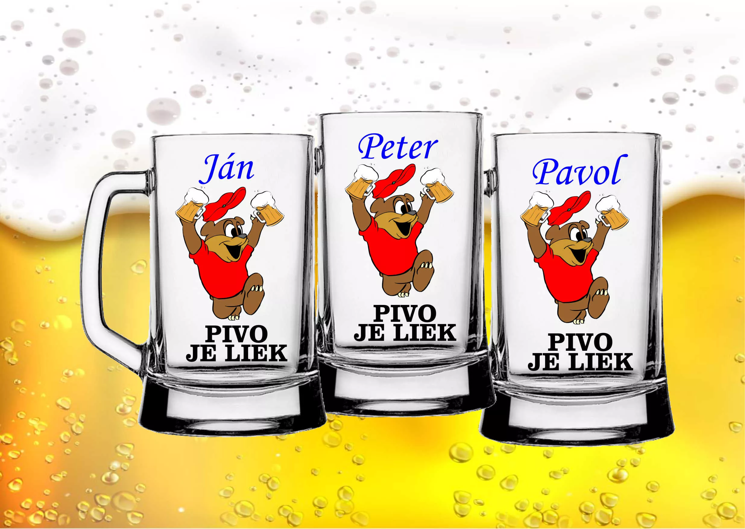 Pivný pohár je o objeme 0,5l. Obrázok je sklárska nálepka, teda je trvácny. Vypálené v peci na 600C. Na krígli je obrázok šťastného pivára s nápisom "Pivo je liek" a menom, ktoré si len želáte.