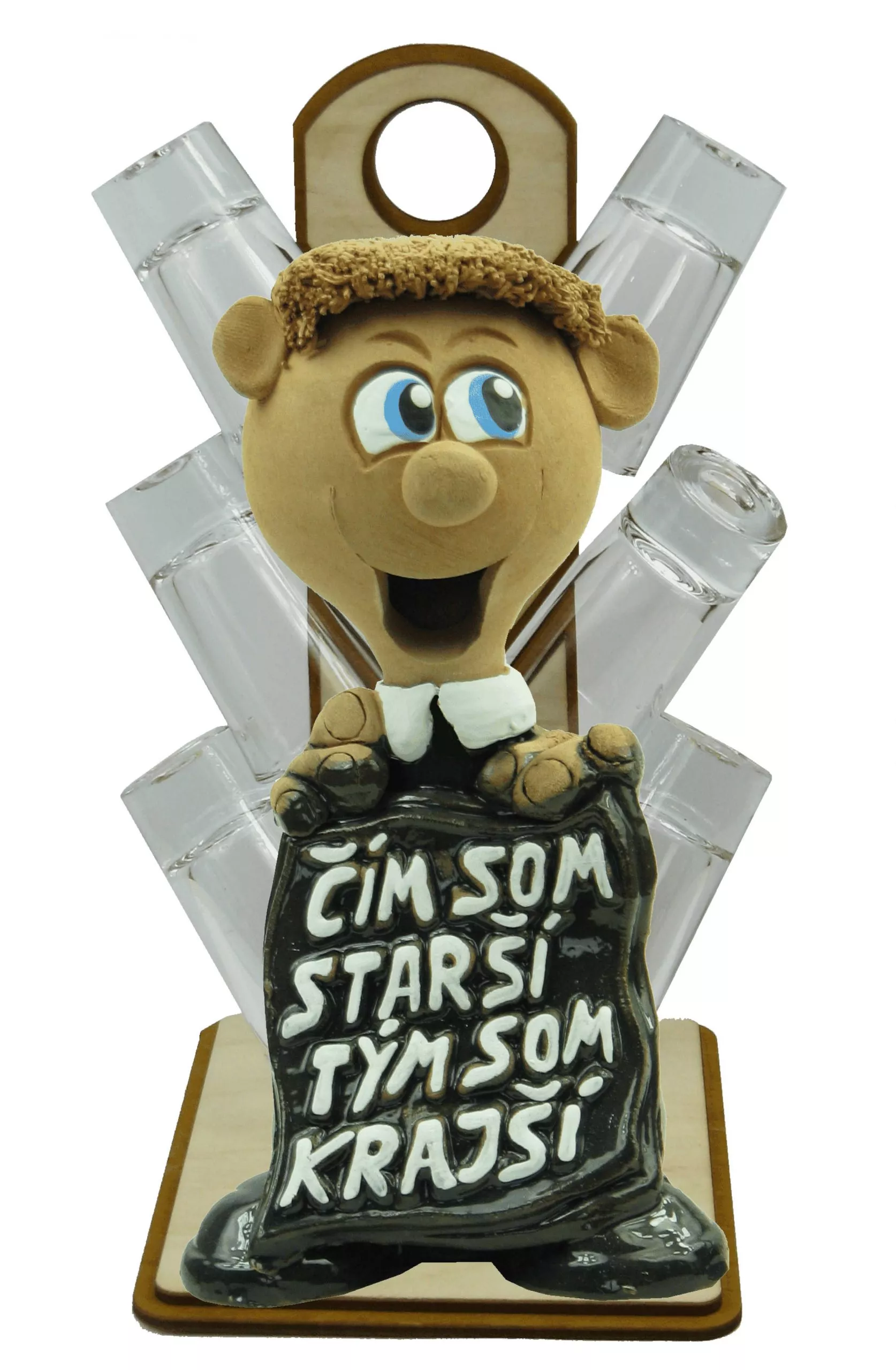 Výrobok sa skladá s dreveného stojana na ktorom je šesť kvalitných, sklenených pohárikov a postavička s nápisom “ čím som starší, tým som krajší“.